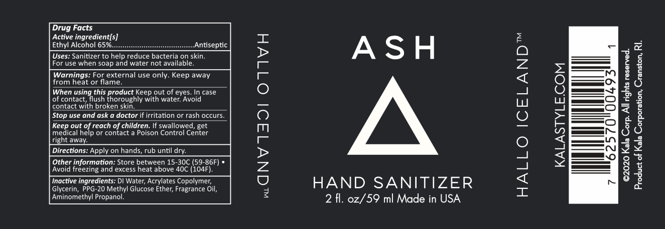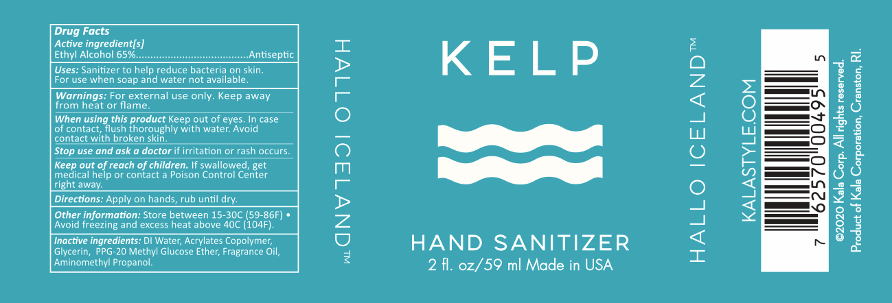 This is a 2 fl. oz./59 ml bottle of hand sanitizer made by Kala Corp, marketed under the brand name Hallo Iceland. Its active ingredient is Ethyl Alcohol (65%) which serves as an antiseptic for reducing bacteria on the skin. The sanitizer is intended for use when soap and water are unavailable. Directions on the bottle indicate it be applied on hands and rubbed until dry. The product should be kept away from heat or flames and stored between 15-30°C (59-86°F) temperate range to avoid freezing and excess heat above 40°C (104°F). In addition, when the product comes into contact with the eyes and broken skin, it should be immediately rinsed with water. Inactive ingredients in the product include DI Water, Acrylates Copolymer, Glycerin, PPG-20 Methyl Glucose Ether, Fragrance Oil, and Aminomethyl Propanol. If a user experiences an irritation or rash after using it, they should seek medical help or stop use.*