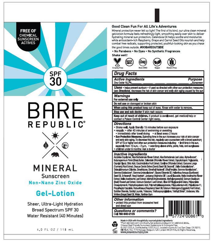 The following image provide visual information about the product associated with Coola Bare Republic Mineral Body Gel-lotion Spf 30 NDC 79753-042 by Coola Llc, such as packaging, labeling, and the appearance of the drug itself. This resource could be helpful for medical professionals, pharmacists, and patients seeking to verify medication information and ensure they have the correct product.