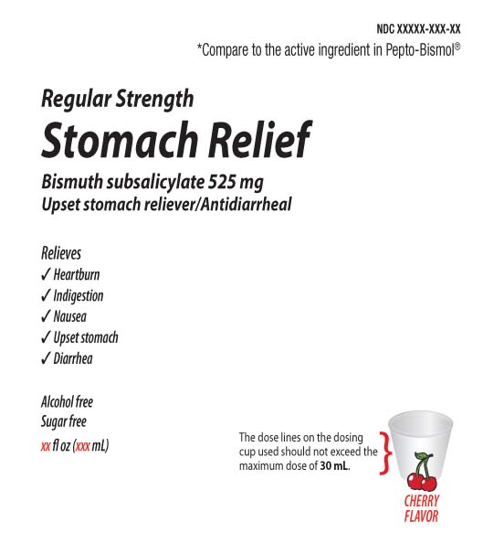 This text appears to be a product label for a stomach relief medication called "NOG XAUX-KKERX." It is a regular strength formula containing Bismuth subsalicylate as the active ingredient, with a dosage of 525 mg. The product is intended for relieving upset stomach, heartburn, indigestion, nausea, and diarrhea. It is alcohol-free and sugar-free, with a cherry flavor. The recommended maximum dose is 30mL. The product can be compared to the active ingredient in Pepto-BismolĀ®.*
