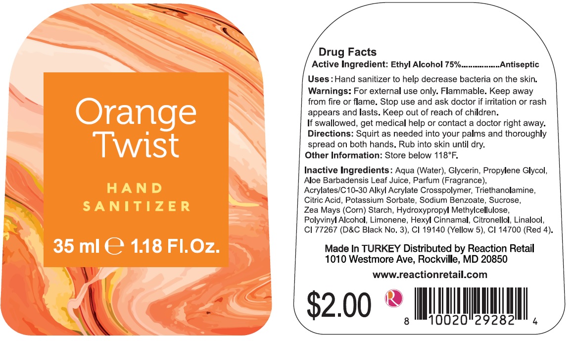 The following 2 images provide visual information about the product associated with Orange Twist Hand Sanitizer NDC 80026-006 by Reaction Retail, Llc, such as packaging, labeling, and the appearance of the drug itself. This resource could be helpful for medical professionals, pharmacists, and patients seeking to verify medication information and ensure they have the correct product.
