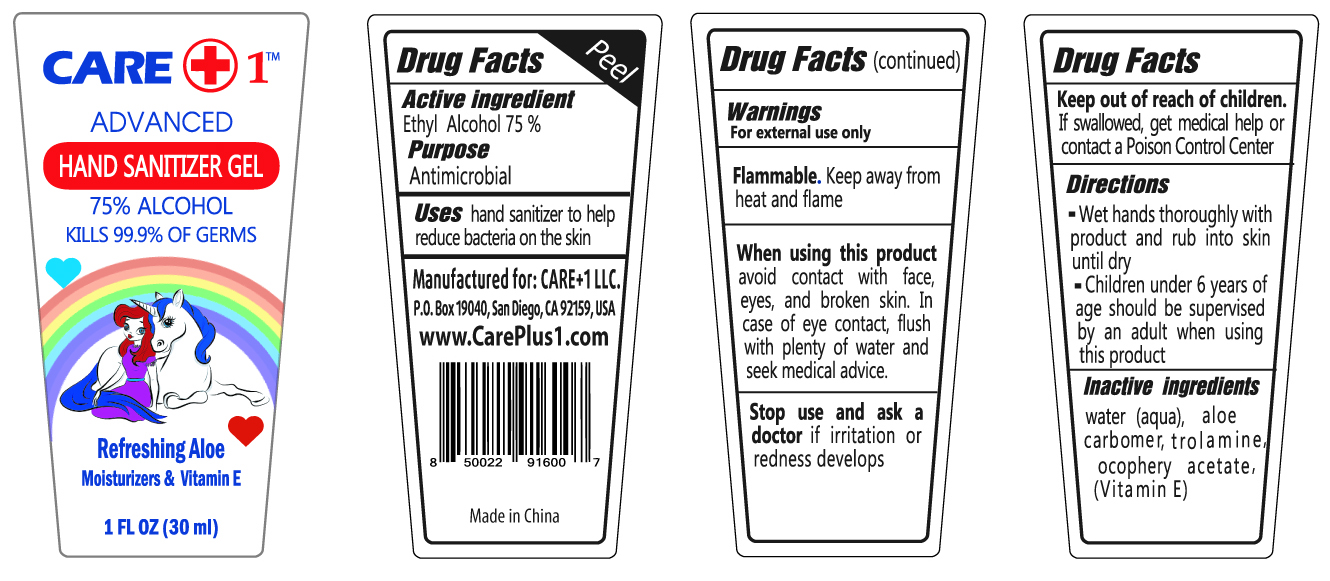 CAREĀ® T ADVANCED HAND SANITIZER GEL is a disinfectant that contains 75% ethyl alcohol and can kill 99.9% of germs. It is also formulated with refreshing aloe, moisturizers, and Vitamin E. This product is made in China and is manufactured for CARE#1LLC, based in San Diego, USA. Its purpose is to reduce bacteria on the skin, but users are strongly advised to keep it away from the face, eyes, and broken skin. If swallowed, contact a Poison Control Center immediately. The inactive ingredients include water, carbomer, trolamine, and tocopheryl acetate. This product is ideal for personal hygiene and sanitizing purposes.*