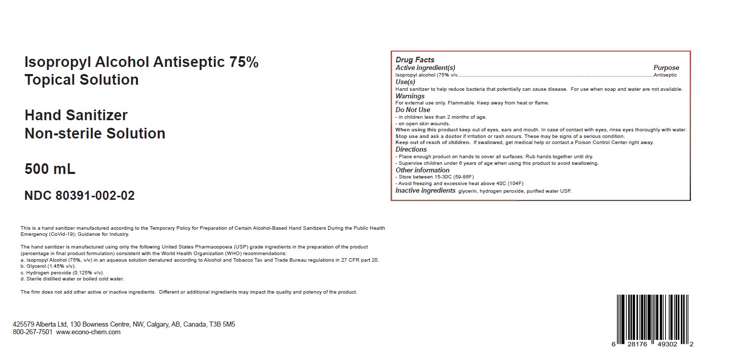 The following 3 images provide visual information about the product associated with Hand Sanitizer NDC 80391-002 by 425579 Alberta Ltd, such as packaging, labeling, and the appearance of the drug itself. This resource could be helpful for medical professionals, pharmacists, and patients seeking to verify medication information and ensure they have the correct product.