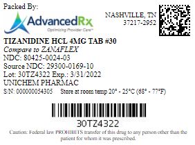 Tizanidine HCL 4mg Tab Qty 30 NDC 80425 0024