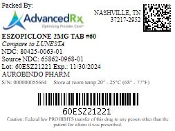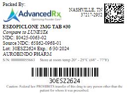 The following 3 images provide visual information about the product associated with Eszopiclone NDC 80425-0063 by Advanced Rx Of Tennessee, Llc, such as packaging, labeling, and the appearance of the drug itself. This resource could be helpful for medical professionals, pharmacists, and patients seeking to verify medication information and ensure they have the correct product.