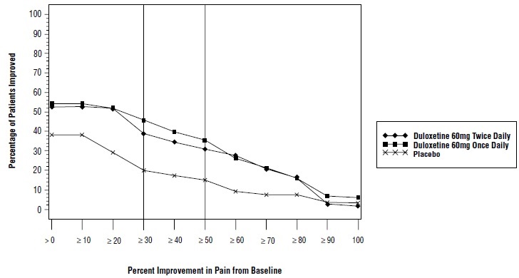 This appears to be a chart comparing the percentage of patients who saw improvement in pain from a baseline measurement using different treatments. The chart lists Duloxetine taken twice daily, Duloxetine taken once daily, and a placebo. The percentage of patients who saw improvement in pain is shown as 100% for the Duloxetine taken twice daily treatment, and there are visual bars representing the percentage improvement for the other treatments.*