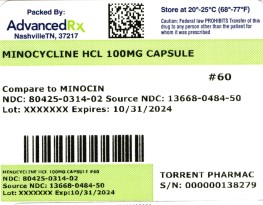 This is a description of an item called "Advanced MINOCYCLINE HCL 100MG CAPSULE". It comes in a pack of 30 capsules. It is compared to another product called MINOCIN. The NDC number is 80336-0314-01 and the source NDC is 13668-0484-50. The expiry date of this item is 10/31/2023. There is also a code at the bottom which reads "57N 000000138275".*