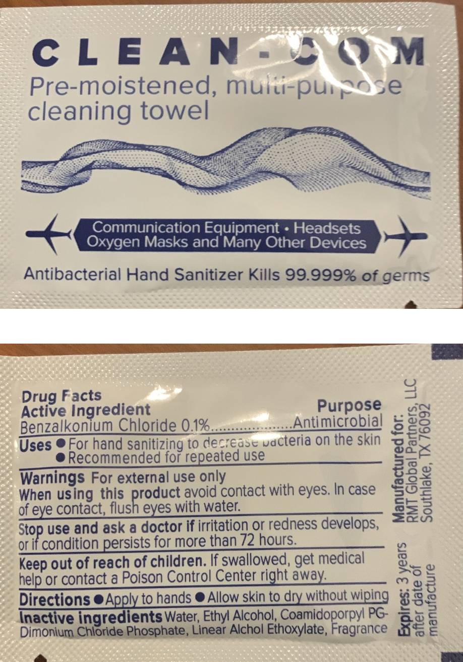 This is a description of a pre-moistened and multi-purpose cleaning towel called CLEAN-COM. It is designed for use with communication equipment, headsets, oxygen masks, and other devices. The towel contains an antibacterial hand sanitizer that is effective in killing 99.999% of germs. The active ingredient is Benzalkonium Chloride at 0.1% concentration for antimicrobial properties. The product is recommended for hand sanitizing to reduce bacteria on the skin and can be used repeatedly. The directions advise applying the sanitizer to hands and allowing the skin to dry without wiping. The inactive ingredients include Water, Ethyl Alcohol, Coamidopropyl PG-Dimonium Chloride, Linear Alcohol Ethoxylate, and Fragrance. It is manufactured for RMT Global Partners, LLC in Southlake, TX 76092 and has a shelf life of 3 years from the manufacturing date.*