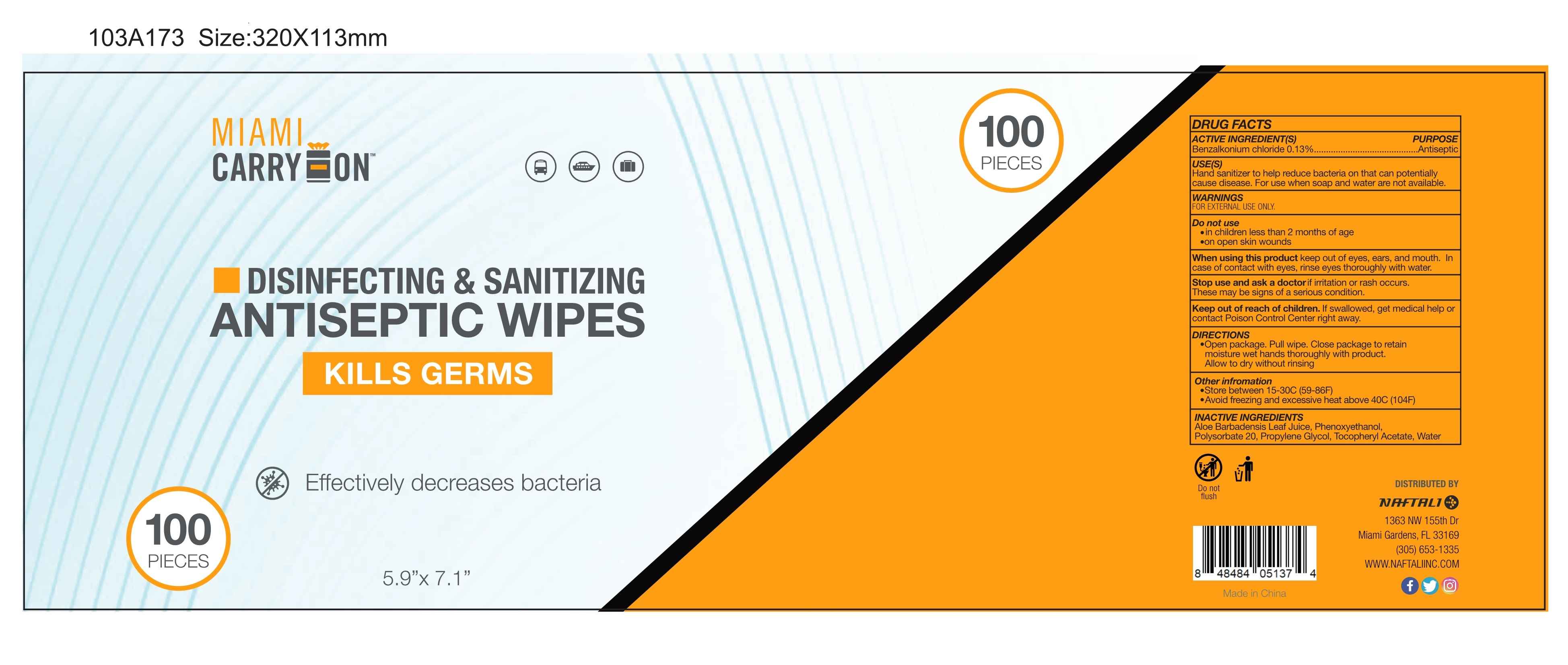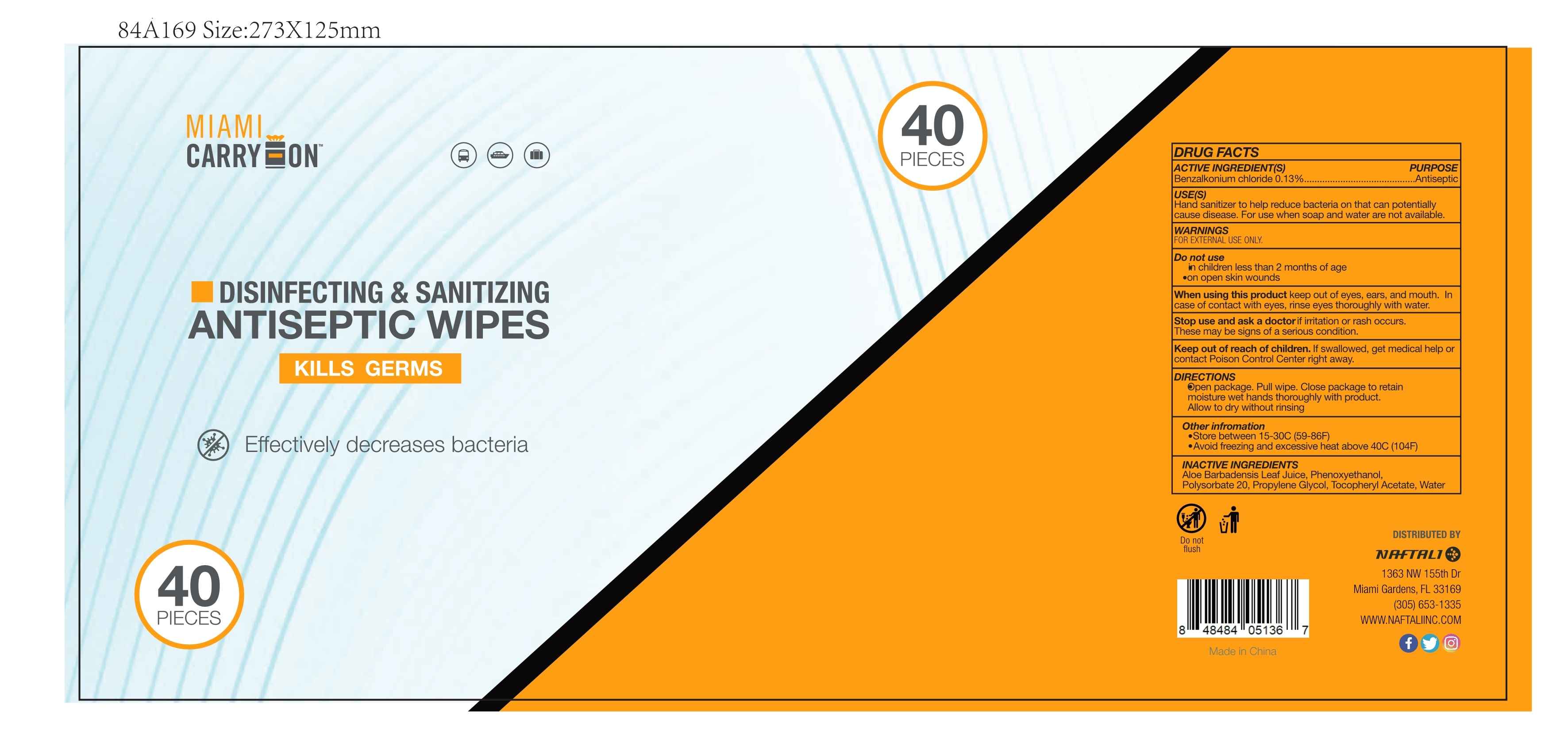 This is a drug fact label and product description for Miami Carry-On Hand Sanitizer Wipes. The wipes contain Benzalkonium Chloride 0.13% as an active ingredient and help reduce bacteria that can cause disease. The package contains 50 wipes with aloe and is intended to be used when soap and water are not available. There are warnings to avoid contact with eyes, ears, and mouth and to supervise children under six years old when using the product. Inactive ingredients include aloe barbadensis leaf juice, polysorbate 20, and tocopheryl acetate. The product is distributed by Naftali Inc. located in Miami Gardens, Florida. Made in China.*