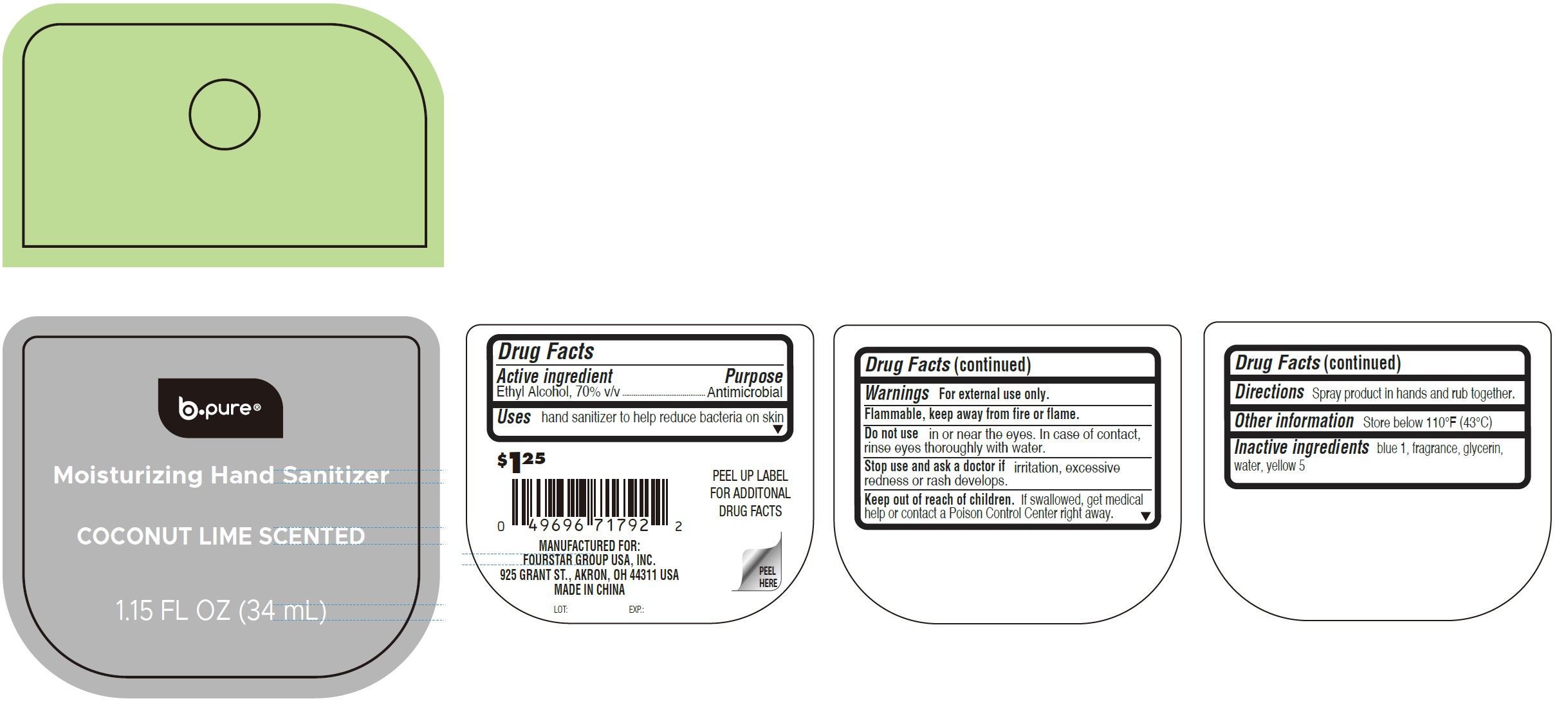 The following image provide visual information about the product associated with B Pure Moisturizing Hand Sanitizer Coconut Lime Scented NDC 80684-126 by Fourstar Group Usa, Inc, such as packaging, labeling, and the appearance of the drug itself. This resource could be helpful for medical professionals, pharmacists, and patients seeking to verify medication information and ensure they have the correct product.