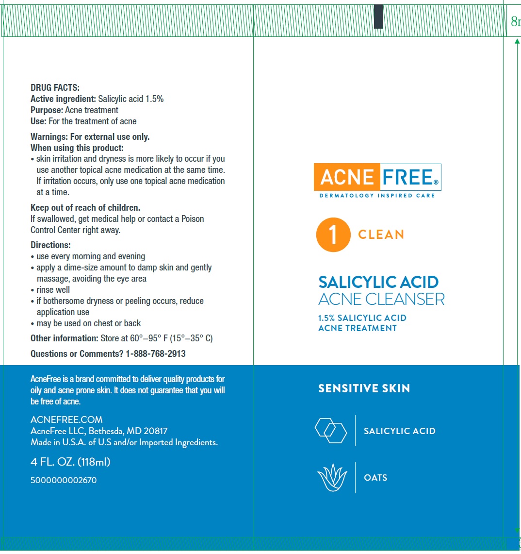 This is a drug facts label on a product containing 1.5% salicylic acid as an active ingredient, meant for the treatment of acne. The product is to be used externally and is to be applied twice a day, in the morning and evening. The label includes a warning to avoid using other topical acne medication at the same time as skin irritation and dryness are more likely to occur in such cases. Additionally, the product should be kept out of reach of children and should be stored at a temperature of 60°-95° F (15°~35° C). The product is manufactured by AcneFree LLC and is made in the USA.*