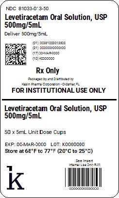 This is a description of Levetiracetam Oral Solution, USP containing 500mg/5mL. It specifies the product is for institutional use only and comes in a packaging of 50 single-unit dose cups. The expiration date and lot number are mentioned as KOODOD0D. Storage instructions recommend keeping it at temperatures between 68°F to 77°F (20°C to 25°C).*