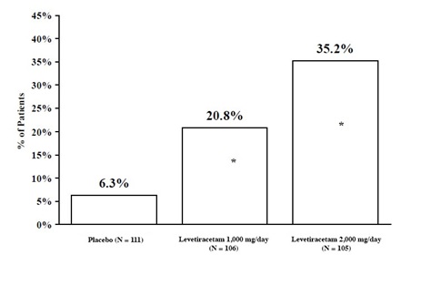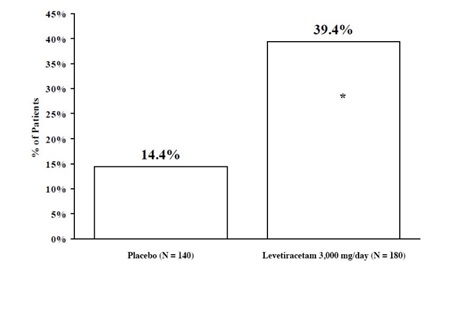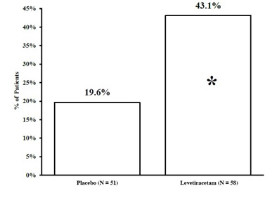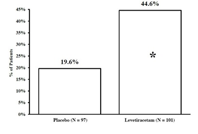 The text provides information about percentages for two different groups, a placebo group (X = 97) and a Levetiracetam group (N = 101). The percentages shown are 44.6% and 19.6%. This data is likely related to a study or research comparing the effectiveness of the placebo and the medication Levetiracetam.*