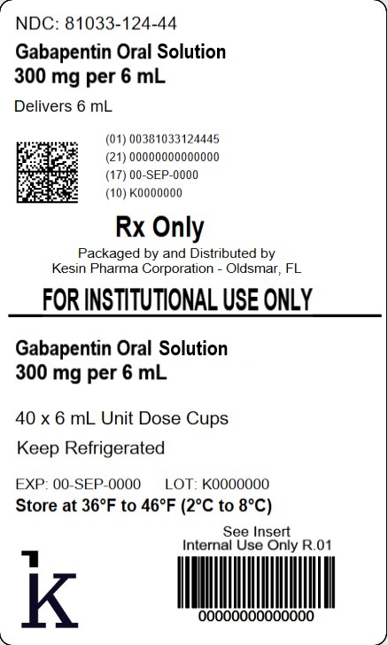 This is information about Gabapentin Oral Solution containing 250 mg per 5 mL, packaged and distributed by Kesin Pharma Corporation in Oldsmar, FL. The solution is intended for institutional use only and comes in individual 5 mL unit dose cups that must be kept refrigerated between 36°F to 46°F (2°C to 8°C). The expiration date is mentioned as 00-SEP-0000 with LOT number KO0O00000. Further details can be found in the insert provided with the product.*