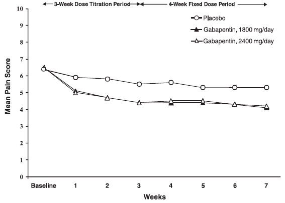This text provides a breakdown of the mean pain score over different weeks, including a 3-week Dose Titration Period and a subsequent 4-week Fixed Dose Period. The text also mentions the dosages used, which include Placebo, Gabapentin at 1800 mg/day, and Gabapentin at 2400 mg/day. It seems to be part of a study or experiment tracking pain scores over time with different treatments.*