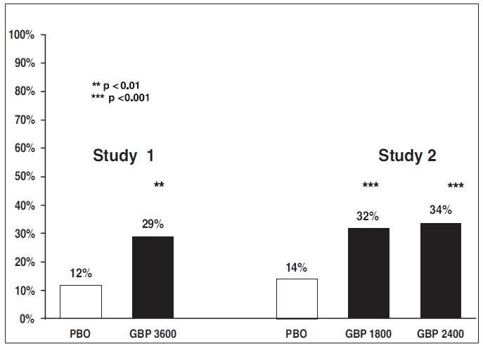 This text appears to be a list showing percentages and statistical values related to a study or studies comparing the impact of different amounts of PBO and GBP (possibly a study on economics or finance). The percentages range from 0% to 100%, with indication of significance (p<0.01 and p<0.001). The studies are labeled as Study 1 and Study 2, hinting at a comparative analysis.*