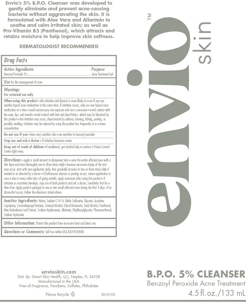 Envio's 5% B.P.O. Cleanser is a Benzoyl Peroxide Acne Treatment that gently eliminates and prevents acne-causing bacteria. It is formulated with Aloe Vera and Allantoin to soothe and calm irritated skin, and Pro-Vitamin B5 to help improve skin softness. The product is Dermatologist Recommended, and free of Fragrance, Parabens, Sulfates, Phthalates. The inactive ingredients in the cleanser include Wote, Sodium, Glycerin, Acrylates copolymer, and Cocamidopropyl betaine, among others. The directions specify the amount to be used and the frequency of application. The warnings must be followed, and the product should be kept out of reach of children.*