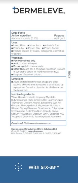 This is a drug facts label for Dermeleve containing Aluminum acetate (0.2%) as the active ingredient. It is for external use only and is used for the treatment of skin conditions such as poison oak, poison sumac, and dermatitis. Users are cautioned to avoid contact with their eyes and not to use on open wounds. The inactive ingredients are also listed. For further information or questions, visit dermeleve.com. Manufactured by Advanced Derm Solutions LLC with a National Drug Code of 04907.*