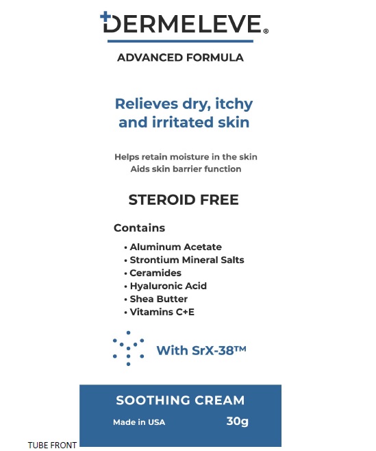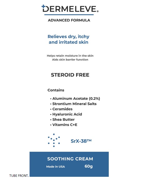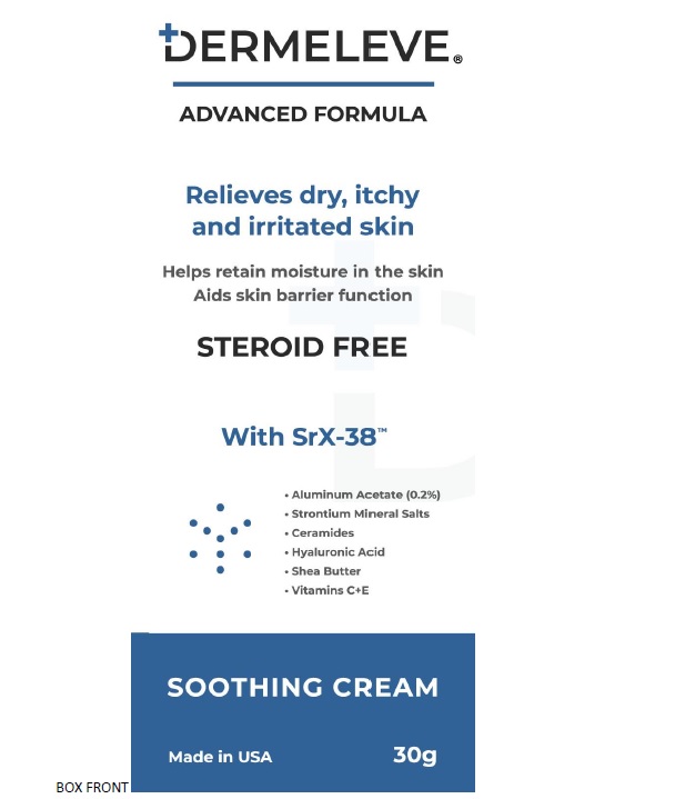 Dermeleve is an advanced formula soothing cream that relieves dry, itchy and irritated skin. It helps to retain moisture in the skin and aids skin barrier function. This cream is steroid free and contains SrXx-38, Aluminum Acetate, Strontium Mineral Salts, Ceramides, Hyaluronic Acid, Shea Butter, Vitamins C+E. The product is made in the USA.*
