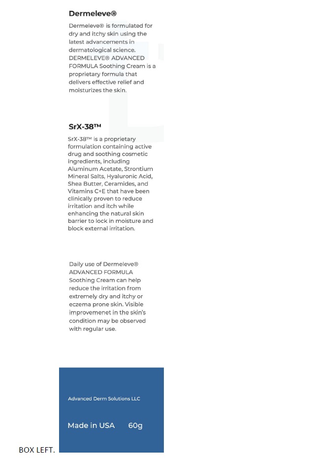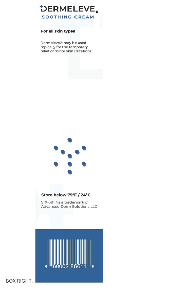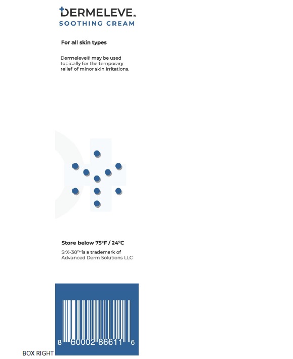 Dermeleve Soothing Cream is a product suitable for all skin types and may provide temporary relief for minor skin irritations when applied topically. It is recommended to store the cream below 75°F / 24°C. The product includes the trademark 5rX-38™ owned by Advanced Derm Solutions LLC. Any further information is not available from the given text.*