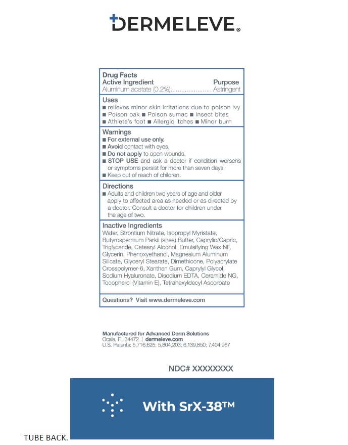 This is a drug facts label for a product called "DERMELEVE, TUBE BACK". The active ingredient in the product is Aluminum acetate (0.2%), which is an astringent. The product is intended to relieve minor skin irritations due to poison ivy, poison sumac, insect bites, athlete's foot, allergic itches, and minor burns. The label contains warnings such as "For external use only", "Avoid contact with eyes", "Do not apply to open wounds", "Stop use and ask a doctor if condition worsens or symptoms persist for more than seven days" and "Keep out of reach of children". The label provides directions for use, which includes applying the product to the affected area as needed or as directed by a doctor for people above two years old. Children under the age of two should consult a doctor. There is a list of inactive ingredients on the label. Finally, there is a website for questions and information about the product and a statement that it is manufactured for Advanced Derm Solutions.*