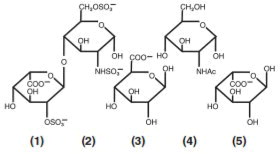 Heparin is a heterogeneous group of straight-chain anionic mucopolysaccharides, called glycosaminoglycans, having anticoagulant properties. Although others may be present, the main sugars occurring in heparin are: (1) α-L-iduronic acid 2-sulfate, (2) 2-deoxy-2-sulfamino-α-D-glucose 6-sulfate, (3) β-D-glucuronic acid, (4) 2-acetamido-2-deoxy-α-D-glucose and (5) α-L-iduronic acid. These sugars are present in decreasing amounts, usually in the order (2)> (1)> (4)> (3)> (5), and are joined by glycosidic linkages, forming polymers of varying sizes. Heparin is strongly acidic because of its content of covalently linked sulfate and carboxylic acid groups. In heparin sodium, the acidic protons of the sulfate units are partially replaced by sodium ions.