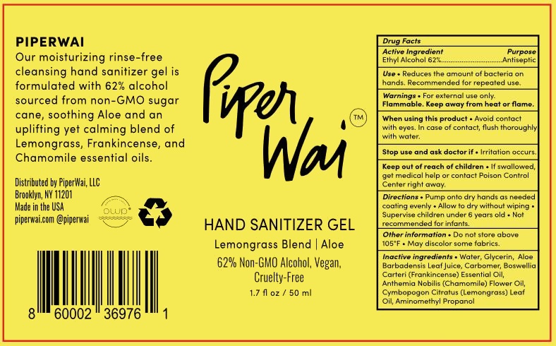 PIPERWAI Hand Sanitizer Gel is a moisturizing rinse-free cleanser that is formulated with 62% non-GMO alcohol sourced from sugar cane, Aloe, and an essential oil blend of Lemongrass, Frankincense, and Chamomile. This vegan and cruelty-free sanitizer comes in a 1.7floz (50ml) pump bottle for easy application. The Drug Facts label shows Ethyl Alcohol 62% as the active ingredient and lists directions, warnings, and inactive ingredients such as water, glycerin, and carbomt. The sanitizer is distributed by Pier„a in the USA.*