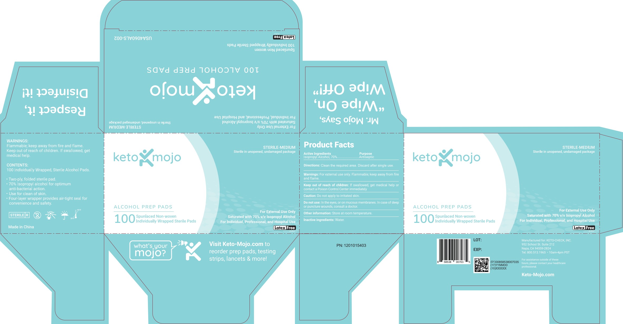 This is a description of an Alcohol Prep Pad made with 70% isopropyl alcohol by Keto-Mojo. It is meant to be used topically to cleanse the intended area. The pad is sterile and should only be used externally. The manufacturer is Keto-Check, Inc. located in Napa, CA, and the product is made in China. The lot number provided is "=24". Full product information can be found on the box of the prep pad.*