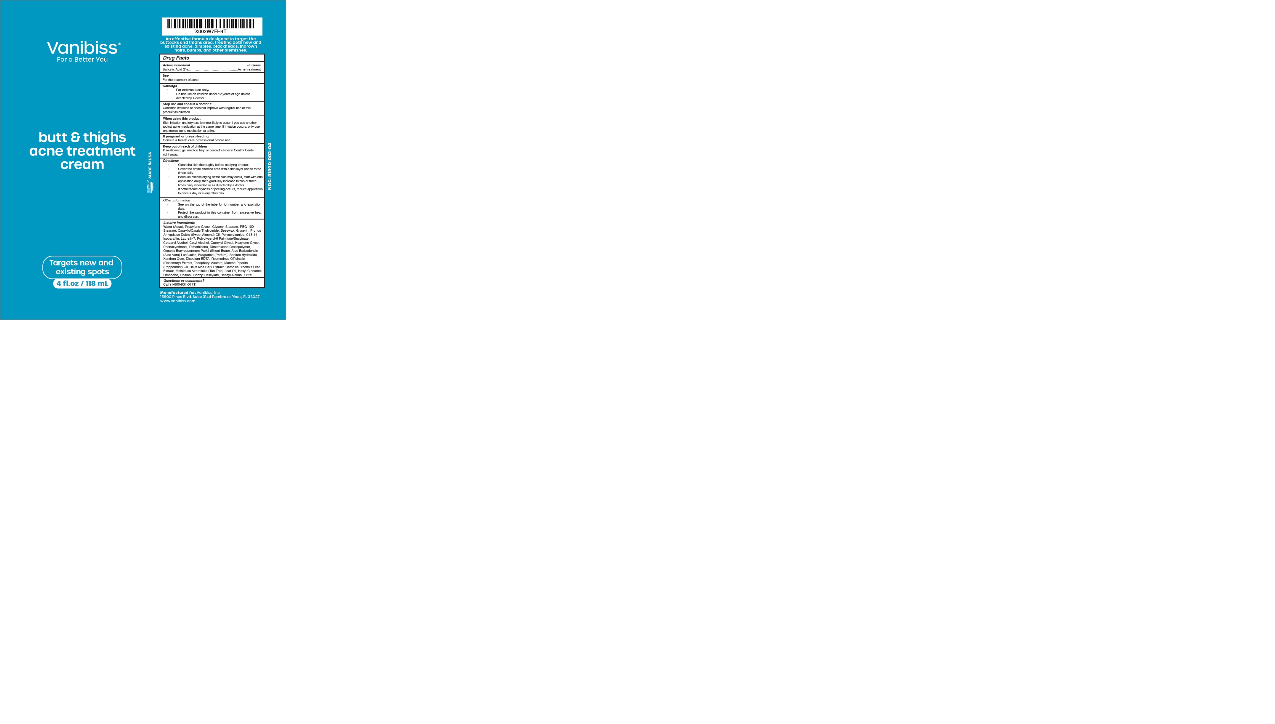 Vanibiss® is an acne treatment cream that targets both new and existing spots on the buttocks and thighs. It contains Salicylic Acid 2% as the active ingredient. This formula is effective in treating acne, pimples, blackheads, ingrown hairs, bumps, and other blemishes. It is for external use only and should not be used on children under 12 years of age without doctor's direction. If the condition worsens or does not improve with regular use, one should stop using the product and consult a doctor. Skin irritation and dryness may occur if another topical acne medication is used at the same time. Pregnant or breastfeeding individuals should consult a healthcare professional before using this product. It should be kept out of reach of children and in case of accidental ingestion, medical help should be sought immediately. The directions for use include cleaning the skin thoroughly before applying the product and applying a thin layer to the affected area one to three times daily. The frequency of application can be increased as needed or as directed by a doctor. If dryness or peeling occurs, the application can be reduced to once a day or every other day. The product should be protected from excessive heat and direct sun. The cream contains various inactive ingredients, and for any questions or comments, one can contact Vanibiss, Inc at 1-800-831-0171.*