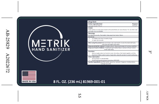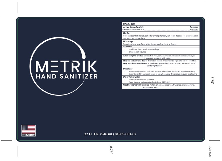The following 3 images provide visual information about the product associated with Hand Sanitizer NDC 81969-001 by Metrik Sanitizer, such as packaging, labeling, and the appearance of the drug itself. This resource could be helpful for medical professionals, pharmacists, and patients seeking to verify medication information and ensure they have the correct product.