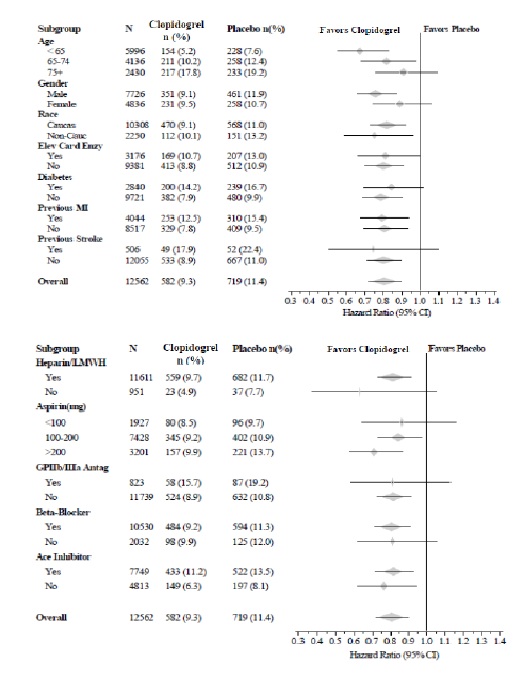 This appears to be a summary of a clinical trial evaluating the effectiveness of clopidogrel versus a placebo in reducing the risk of death, reinfarction, or stroke before first discharge. The trial involved over 2000 participants and found that clopidogrel resulted in a 9% reduction in risk compared to the placebo, with a significance level of p=0.002. The number of events in the clopidogrel group was not provided in the given text.*