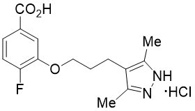 Acoramidis HCl is a transthyretin stabilizer. The chemical name of acoramidis HCl is 3-[3-(3,5-dimethyl-1H-pyrazol-4-yl)propoxy]-4-fluorobenzoic acid hydrochloride. The molecular formula is C15H18FN2O3Cl, and the molecular weight is 328.77 g/mol. The structural formula is: