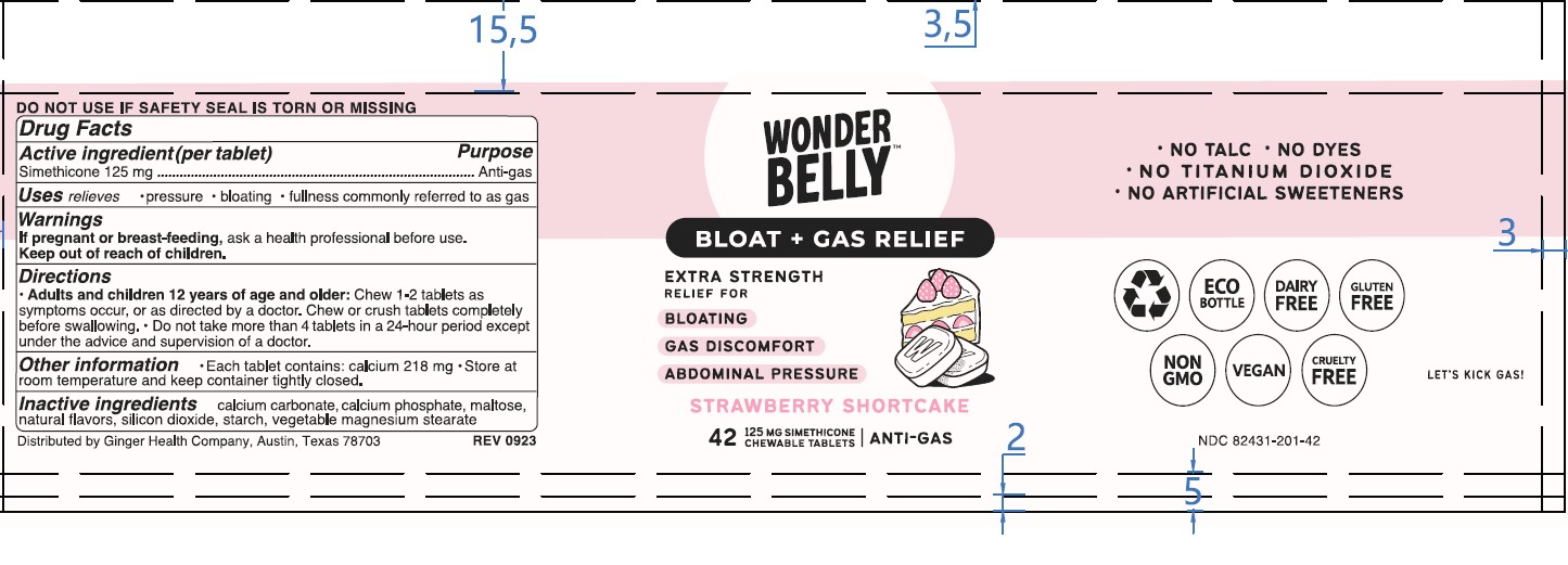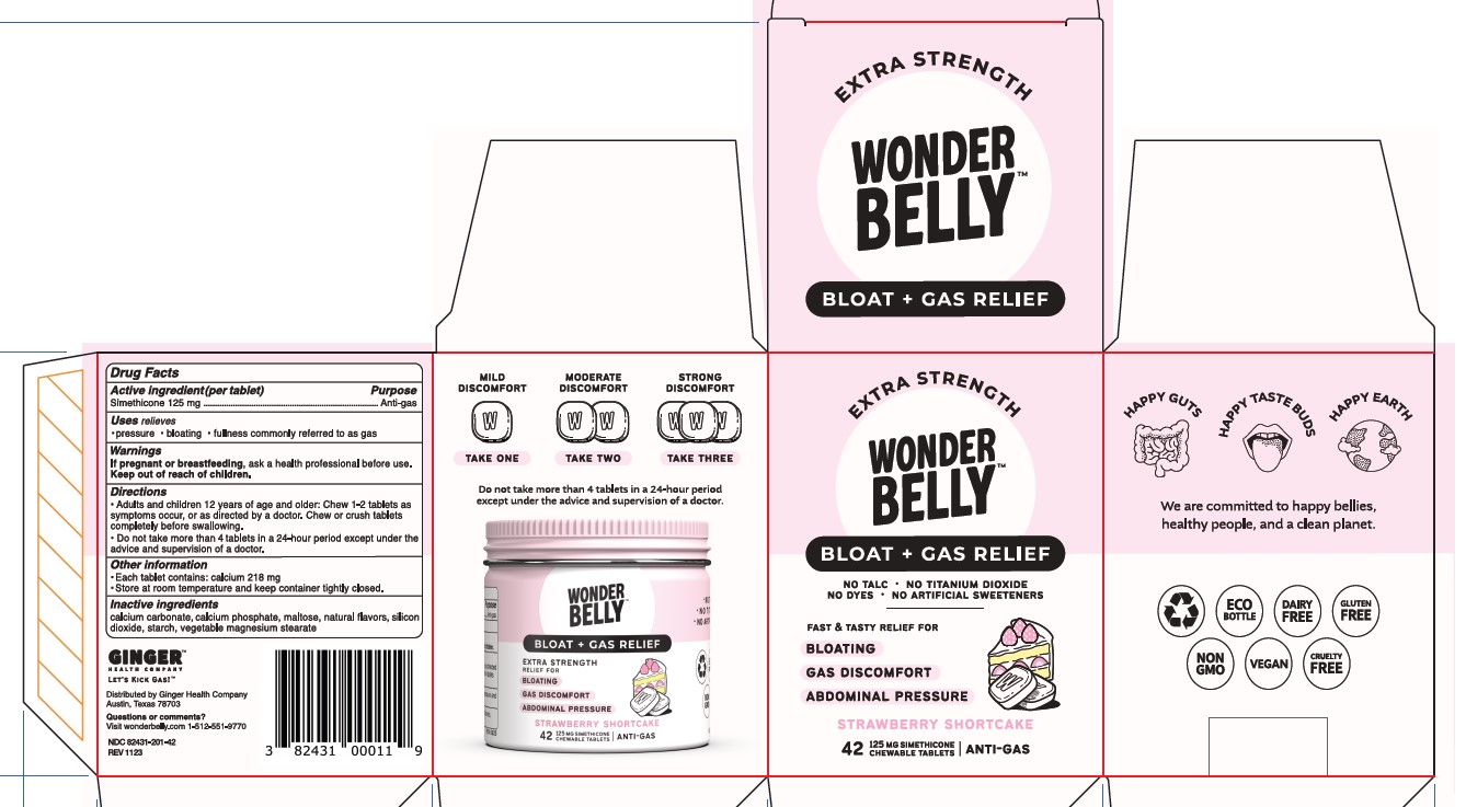 The following 2 images provide visual information about the product associated with Wonderbelly Extra Strength Anti-gas NDC 82431-201 by Ginger Health Company, such as packaging, labeling, and the appearance of the drug itself. This resource could be helpful for medical professionals, pharmacists, and patients seeking to verify medication information and ensure they have the correct product.