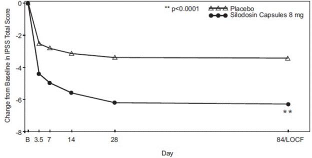 Change from Baseline in IPSS Total Score comparing Silodosin capsules 8 mg with the Placebo group on Day 357 was statistically significant (p<0.0001).*