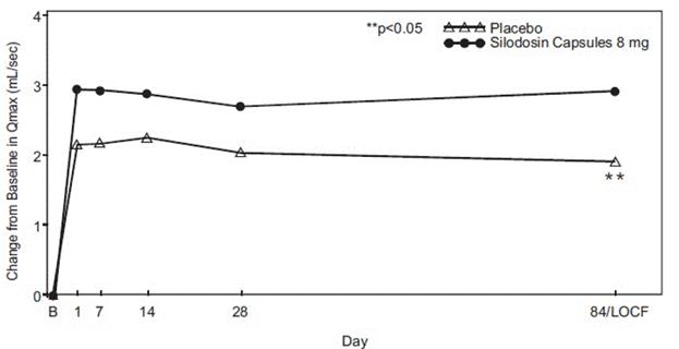 This text provides information about the change in maximum flow rate (Qmax) in milliliters per second (mL/sec) from baseline to day 84 in a clinical study comparing ArAeh placebo and Silodosin Capsules 8mg. The statistical significance is indicated with *p<0.05. The data is recorded on days 14, 28, and 84 (or last observation carried forward - LOCF).*
