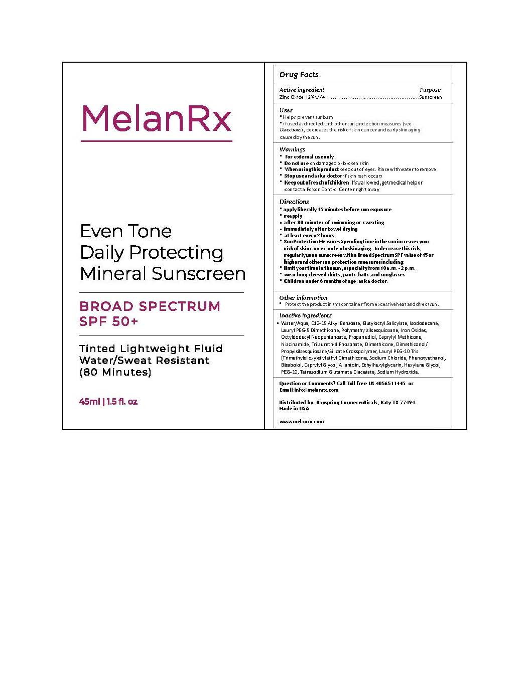 MelanRx is a daily protecting mineral sunscreen with a Broad Spectrum SPF 50+ that helps prevent skin cancer and early skin aging. It is a tinted lightweight fluid that is water/sweat resistant for up to 80 minutes. The sunscreen should be applied 5 minutes before sun exposure, then reapplied every 2 hours or after 80 minutes of swimming or sweating. This product contains Zinc oxide as an active ingredient. This product is for external use only and should not be used on damaged or broken skin. If a rash occurs, stop using the product and consult a doctor. Keep out of reach of children. For questions or comments call Tl Free US 405 6511445 or Email infogmelanncom. The product is distributed by Dayspring Cosmeceuticals in Katy, TX and made in the USA.*