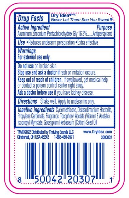 This is a description of a deodorant product. The product contains active ingredients such as aluminum zirconium pentachlorohydrate gly and it is used to reduce underarm perspiration. The product comes with warnings such as not to use on broken skin and if irritation occurs to consult a doctor. It also advises to keep away from children and to seek medical help if swallowed. The direction for use is to shake well and apply only to underarms. The product is distributed by Brands LLC and their website is dryidea.com. The manufacturing date is not available.*