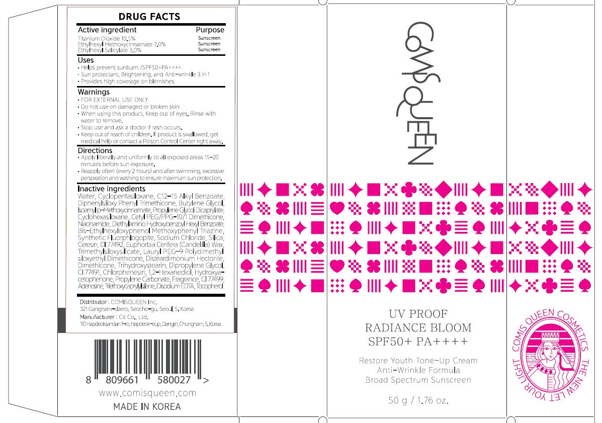 The following image provide visual information about the product associated with Comisqueen Uv Proof Radiance Bloom NDC 82759-010 by Comis Queen Inc., such as packaging, labeling, and the appearance of the drug itself. This resource could be helpful for medical professionals, pharmacists, and patients seeking to verify medication information and ensure they have the correct product.