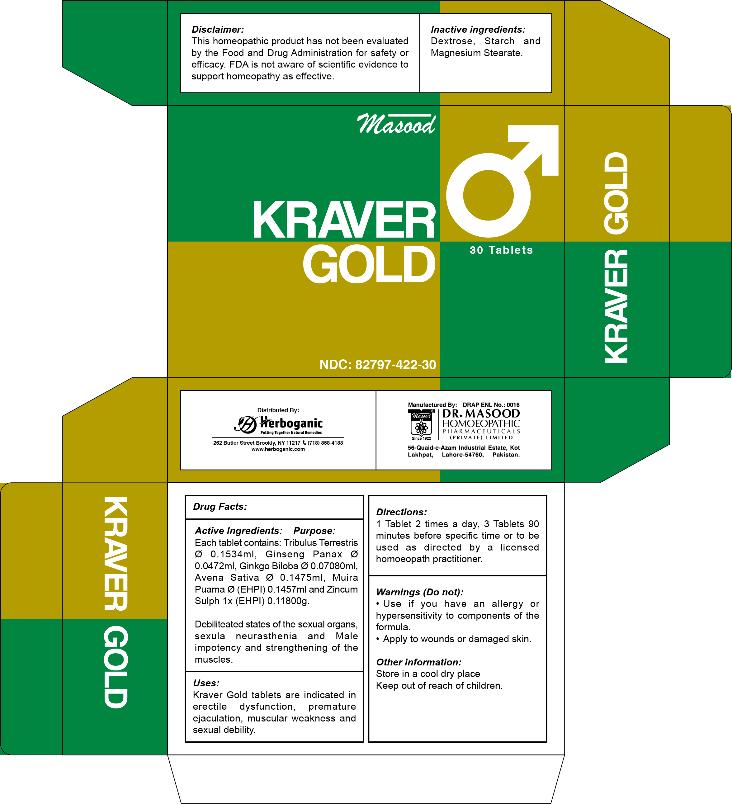 The following image provide visual information about the product associated with Kraver Gold NDC 82797-422 by Dr. Masood Homeopathic Pharmaceuticals Private Limited, such as packaging, labeling, and the appearance of the drug itself. This resource could be helpful for medical professionals, pharmacists, and patients seeking to verify medication information and ensure they have the correct product.