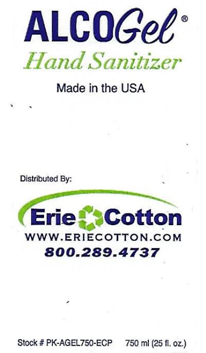 ALCOGel is a hand sanitizer made in the USA and distributed by Erie Cotton. It comes in a 750 ml (25 fl. oz.) container and its stock number is PK-AGEL750-ECP. For more information, visit the website www.eriecotton.com or call 800-289-4737.*