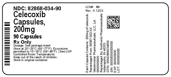 NDC: 82868-034-90 Celecoxib is a medication available in the form of capsules containing 200mg of the active ingredient. There are 90 capsules in each package. This medication is only available with a prescription. Dosage: Follow the instructions provided on the package. Store the medication at a controlled room temperature between 15°C to 30°C (59°F to 86°F), as recommended by USP guidelines. Tamper Evident: Ensure the package is sealed and not tampered with before use. Safety: Keep out of reach of children. Store in the original container. Please note that the provided text contains some illegible characters, making it difficult to interpret certain details.*