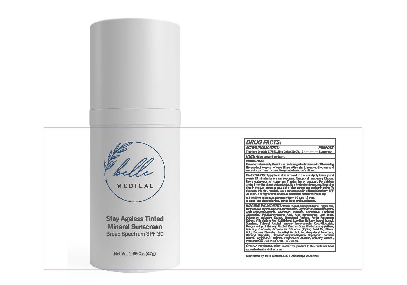 The following image provide visual information about the product associated with Stay Ageless Tinted Mineral Sunscreen Broad Spectrum Spf 30 NDC 82947-0650 by Belle Medical Llc, such as packaging, labeling, and the appearance of the drug itself. This resource could be helpful for medical professionals, pharmacists, and patients seeking to verify medication information and ensure they have the correct product.