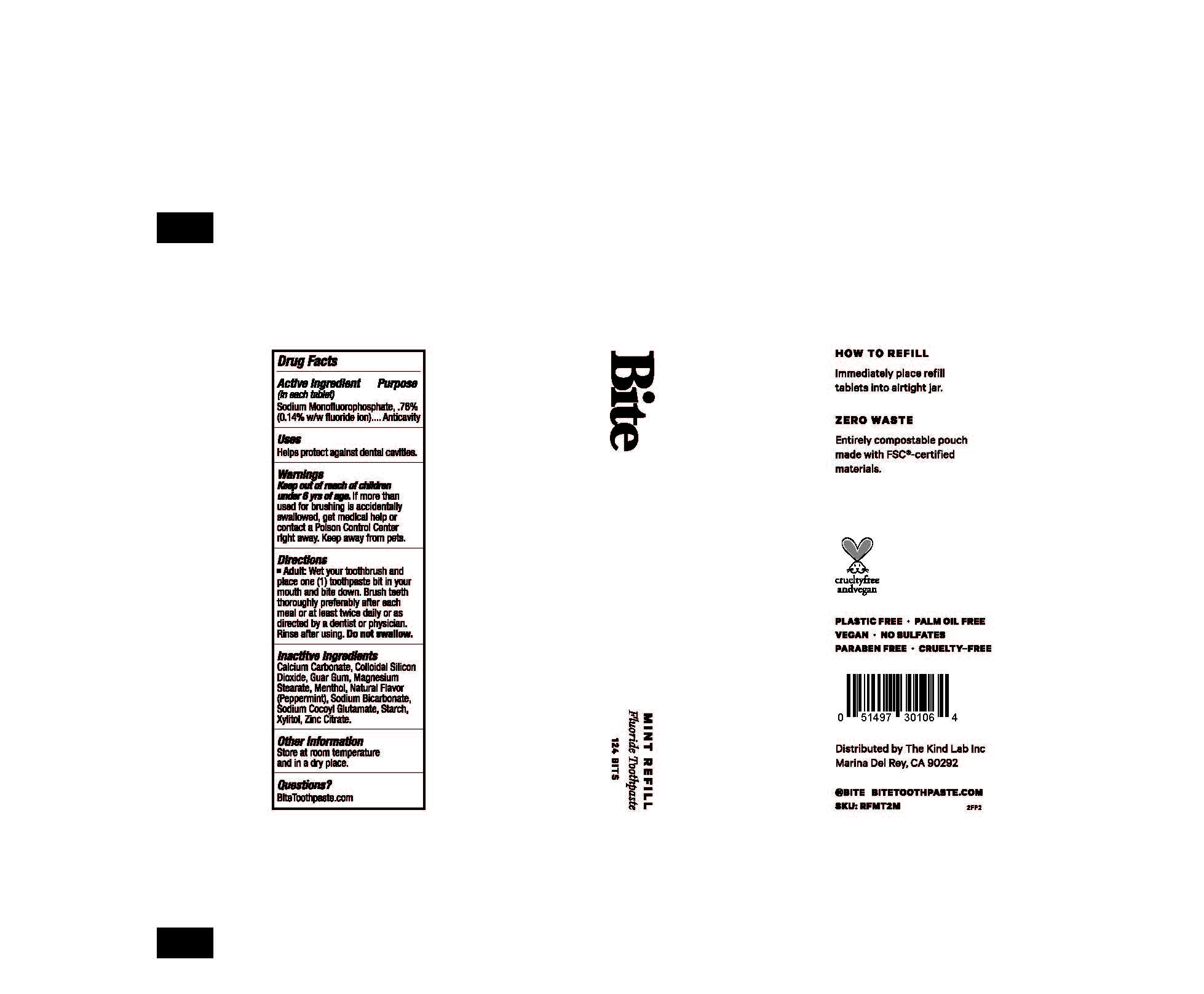 This is a description of a toothpaste containing Sodium Monofluorophosphate which acts as an anticavity agent. The toothpaste is suitable for adults and should be used preferably after each meal or twice daily as directed by a dentist. It also contains inactive ingredients such as magnesium stearate and natural flavors. The toothpaste refill tablets come in an entirely compostable pouch, making it a plastic-free and palm oil-free product. Questions about the product can be directed to bitetoothpaste.com.*