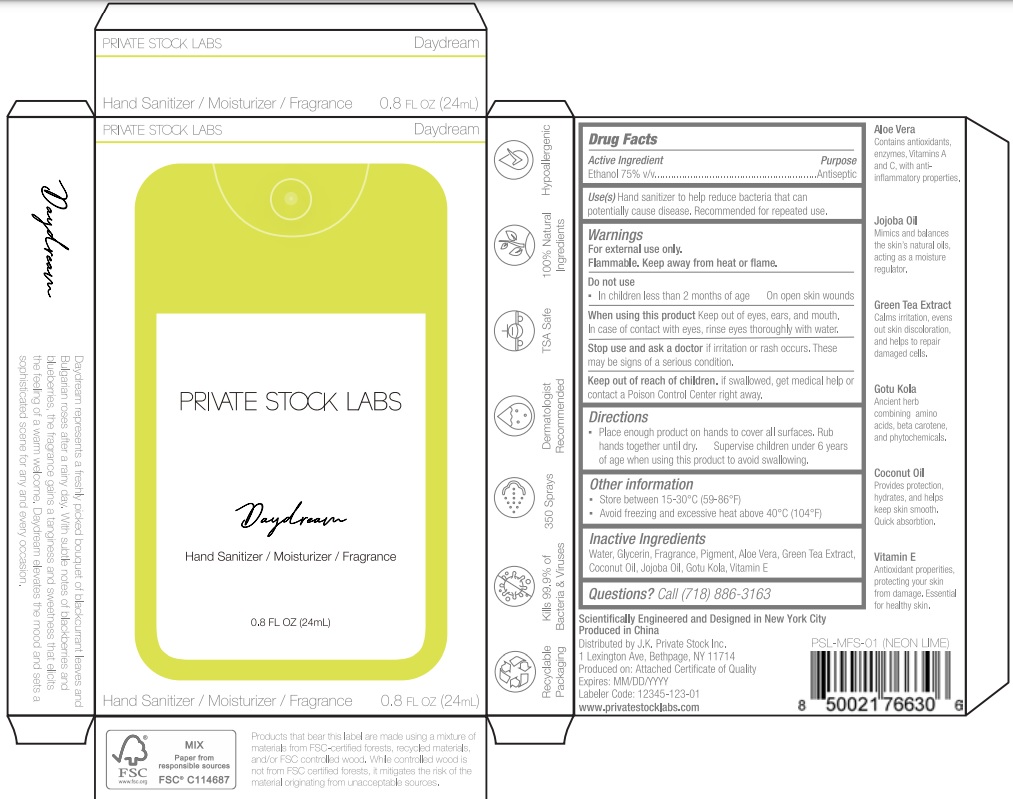 This is a description of a Moisturizer/Fragrance hand sanitizer product manufactured by a company called Fruit Stock Labs. The product contains aloe vera, jojoba oil, and green tea extract among other ingredients. It is advised to keep it away from flames or heat, not use it on open wounds and to avoid contact with eyes, ears, and mouth. If the product causes a rash, the use must be stopped and medical attention sought. The hand sanitizer is packaged in an 8 fl oz, 24 mL bottle and distributed by JK, Private Stock.*