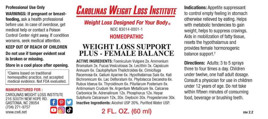 The following image provide visual information about the product associated with Weight Loss Support Plus Female Balance NDC 83014-0001 by Carolinas Weight Loss Institute, such as packaging, labeling, and the appearance of the drug itself. This resource could be helpful for medical professionals, pharmacists, and patients seeking to verify medication information and ensure they have the correct product.