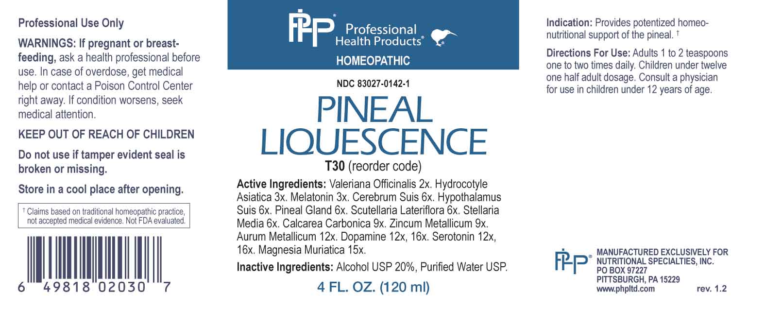 The following image provide visual information about the product associated with Pineal Liquescence NDC 83027-0142 by Nutritional Specialties, Inc., such as packaging, labeling, and the appearance of the drug itself. This resource could be helpful for medical professionals, pharmacists, and patients seeking to verify medication information and ensure they have the correct product.
