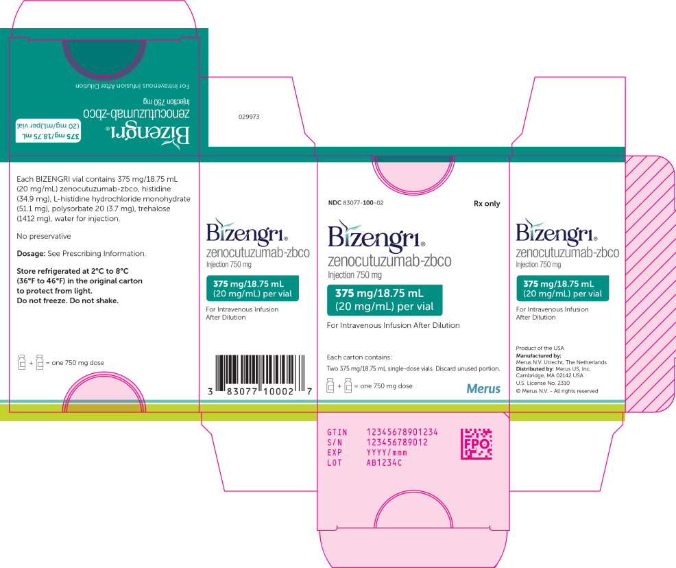The following 3 images provide visual information about the product associated with Bizengri NDC 83077-100 by Merus Us, Inc., such as packaging, labeling, and the appearance of the drug itself. This resource could be helpful for medical professionals, pharmacists, and patients seeking to verify medication information and ensure they have the correct product.