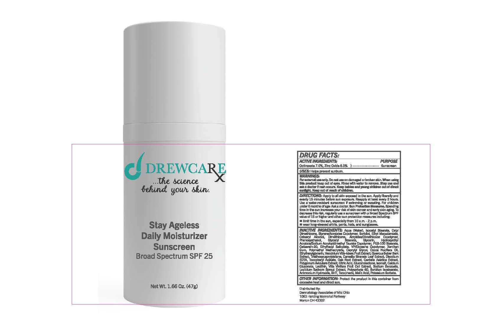 The following image provide visual information about the product associated with Stay Ageless Daily Moisturizer Sunscreen Broad Spectrum Spf 25 NDC 83181-2650 by Derm Asso. Mid Ohio, such as packaging, labeling, and the appearance of the drug itself. This resource could be helpful for medical professionals, pharmacists, and patients seeking to verify medication information and ensure they have the correct product.