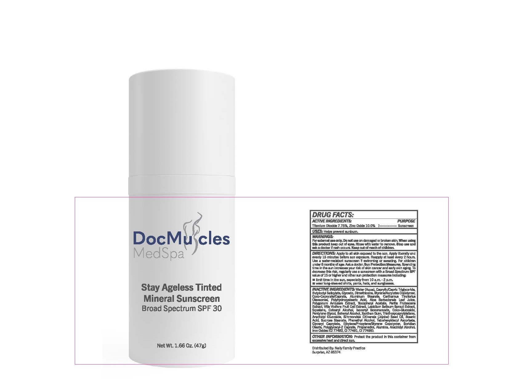 Stay Ageless Tinted Mineral Sunscreen is a product distributed by DocMuicles MedSpa family. It is a broad-spectrum sunscreen with SPF 30 that provides sun protection measures. It is recommended to use this sunscreen 15 minutes before sun exposure and reapply every 2 hours. This product should not be used on damaged or broken skin and should be kept away from the eyes. Additionally, users should limit their time in the sun, especially from 10 a.m. to 2 p.m., and wear protective clothing. The net weight of the product is 1.66 oz. (47g), and it contains inactive ingredients. It is important to protect the product from excessive heat and direct sun.*