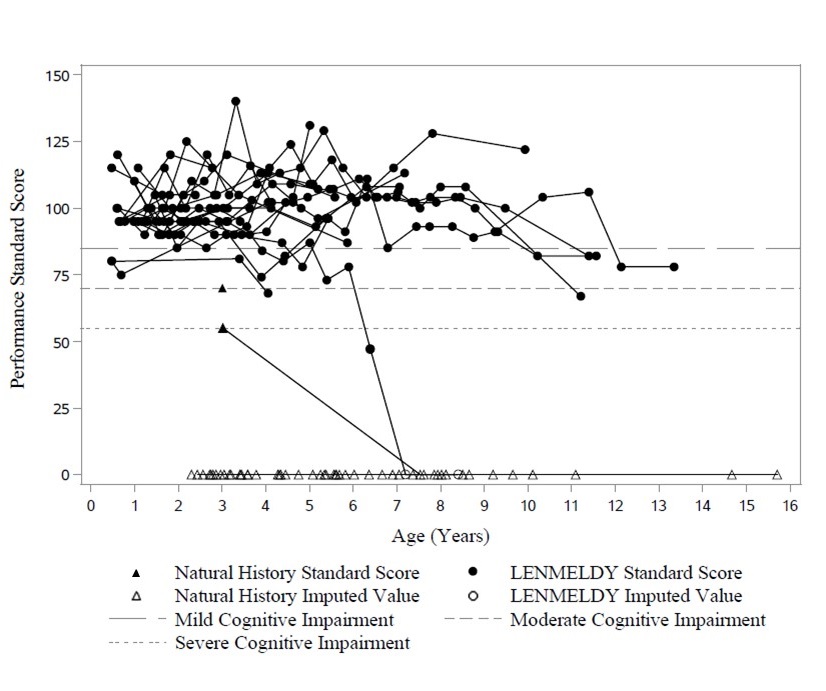This text provides a breakdown of performance standard scores with associated age information for natural history and LENMELDY categories related to cognitive impairment levels. It indicates the standard scores, age range, and severity levels such as mild, moderate, and severe cognitive impairment.*