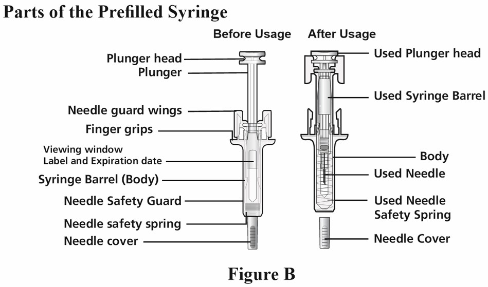 This text provides a breakdown of the parts of a pre-filled syringe, both before and after usage. The parts mentioned include the Plunger head, Plunger, Needle guard wings, Finger grips, Viewing window, Label, Expiration date, Syringe Barrel, Needle Safety Guard, Needle safety spring, Needle cover. It also highlights the parts that are used after usage like the Used Plunger head, Used Syringe Barrel, Used Needle, Used Needle Safety Spring, and Needle Cover. This information can be valuable for understanding the components of a prefilled syringe and how they are used.*